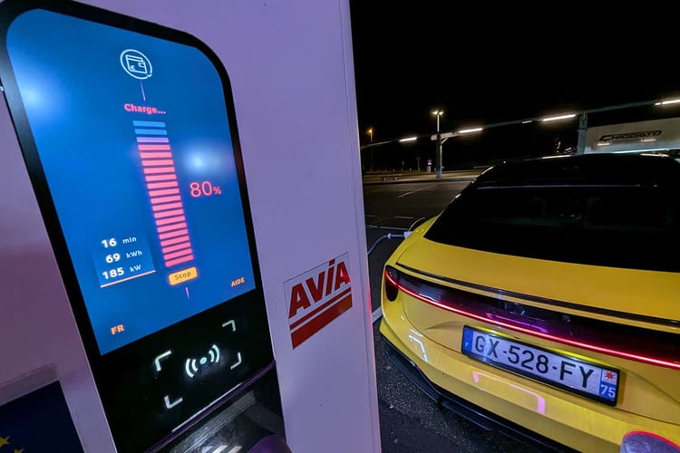Cependant, il ne nous a pas été possible d’effectuer le 10-80 % en 14 minutes comme promis par le constructeur malgré nos précautions techniques. Au final, nous avons enregistré un temps de 15 minutes et 11 secondes très précisément, qui correspond au chrono que mon confrère Valentin Cimino a eu l’occasion de constater en avant-première sur une borne identique (exploitée par Fastned). La performance n’en demeure pas moins impressionnante. Et s’il n’y a que deux minutes d’écart avec la Porsche Taycan (qui, elle, met une minute de moins qu’annoncé d’après nos mesures), la puissance moyenne à la borne de 292 kW est sans équivalent sur le marché. Notons ici que la fin de la recharge est tout aussi expéditive, avec 18 minutes de plus pour atteindre les 100 %. Le plein complet réclame donc 33 minutes. C’est le temps que demande l’écrasante majorité de voitures électriques pour réaliser le 10-80 %…
