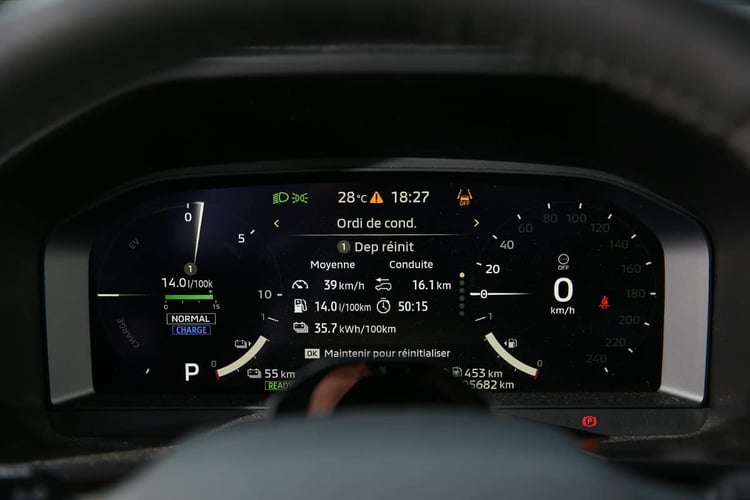 Nous avons donné les consommations enregistrées dans le cadre de nos mesures selon un protocole fixe. En revanche, celles-ci peuvent différer au quotidien, en fonction des routes empruntées ou des recharges effectuées. Voici donc un panel. Avec un plein d’essence sur lequel nous avons effectué notre Supertest et plusieurs trajets quotidiens, nous avons enregistré un appétit moyen de 7,1 l/100 km sur une distance de 457 km. Sur un long trajet de 502 km à travers le centre du pays avec de l’autoroute et des portions de routes secondaires (A77 puis N7), nous avons noté une consommation moyenne de 8,1 l/100 km. Enfin, l’intégralité de notre essai de 1 471 km s’est soldée par une consommation finale de 7,7 l/100 km pour 6,8 kWh/100 km, en considérant tous les pleins et recharges effectués. On retrouve donc la moyenne mesurée en mode Normal batterie vide !