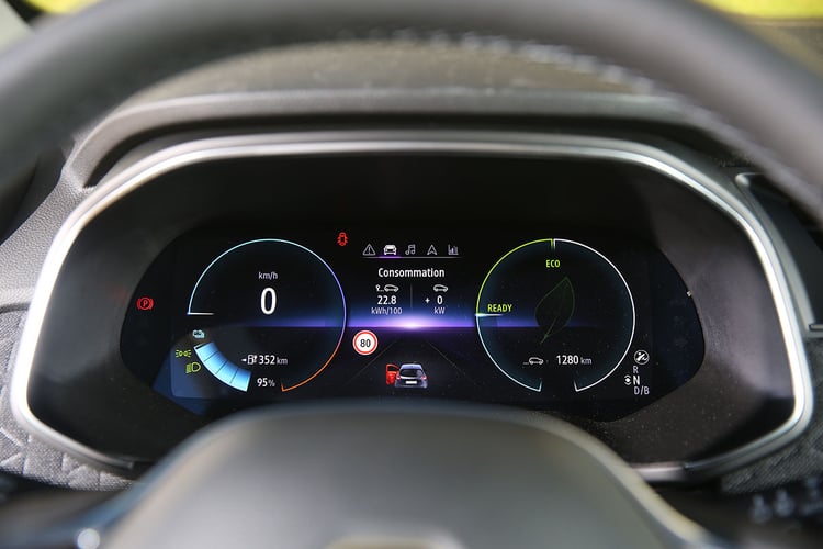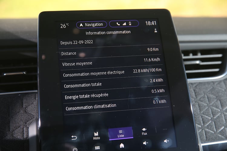 En ville, sa configuration ne pose pas de problème. La direction est douce et le champ de vision dégagé. Cette nouvelle génération a fait un sérieux bond en avant en matière de présentation, de finition et d’équipements. On y retrouve une instrumentation numérique secondée par une tablette tactile centrale de 9,3 pouces EasyLink. La même que l’on retrouve dans les Clio ou Captur, qui conserve par ailleurs ses fâcheuses habitudes. À l’instar d’une tablette premier prix, la mémoire semble ici se saturer au fil des kilomètres : le temps de réponse à l’écran devient de plus en plus long, au point de devenir inutilisable, et le compteur de consommation peut même avouer jusqu’à 10 minutes de retard ! Ce ne serait pas si grave s’il ne mettait pas en défaut le compteur de consommation moyenne au tableau de bord : calculant encore les consommations sur autoroute alors que nous étions en plein centre-ville, le système a fait grimper d’un coup la moyenne urbaine à près de 35 kWh/100 km. Voilà qui nous a obligés à tout recommencer après avoir redémarré la voiture.