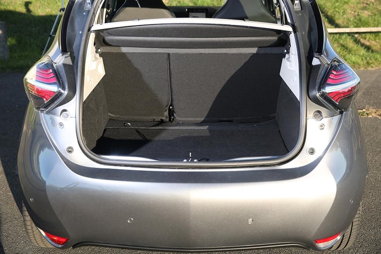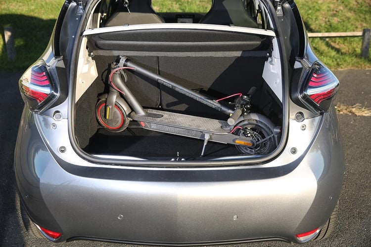 Cet interlude passé, la Renault Zoé est donc la première à recevoir notre deux-roues dans son coffre d’un volume de 338 l à 1 225 l. Comme d’habitude, les porte-à-faux réduits empêchent de mettre les objets longs en position transversale. Impossible d’optimiser l’espace, et il faudra alors mettre la trottinette de biais. Mais on apprécie la profondeur du coffre, qui n’oblige pas à abaisser la banquette 2/3-1/3, alors que la hauteur permet de laisser la plage arrière en place.