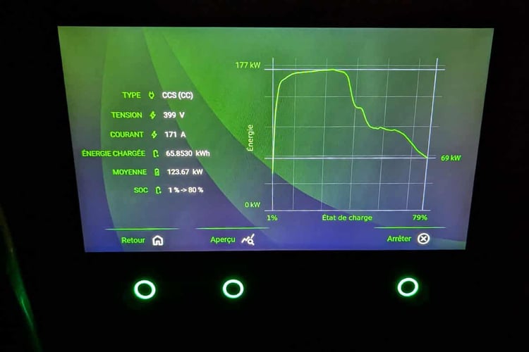 Pour cet essai, nous avons bénéficié de l’un des premiers exemplaires. Une sorte de « licorne » donc, pour reprendre le jargon Tesla. Une fois branché à 10 % de charge, le SUV a tenu ses promesses avec un temps de 28 minutes et 30 secondes très exactement pour atteindre la barre des 80 %. Cela se traduit ici par une puissance moyenne à la borne de 122 kW, qui figure parmi les plus élevées pour une batterie 400 V, hors fabricants premium.