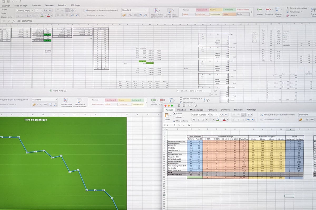 Si nous passons beaucoup d’heure derrière le volant ou plantés à côté des bornes de recharge, le travail n’est pas terminé au moment où nous rendons les clés. Toutes nos données sont ensuite compilées dans des feuilles de calcul spécifiques : vérification de leur cohérence, tri, classement, projections, moyennes, etc. Tout est analysé en détails afin de vous livrer nos conclusions chiffrées les plus précises. On n’enverra pas de fusée sur la Lune avec nos formules devenues pourtant si complexes qu’on en oublie parfois le sens, mais on compte désormais les cellules comme des moutons avant de dormir.