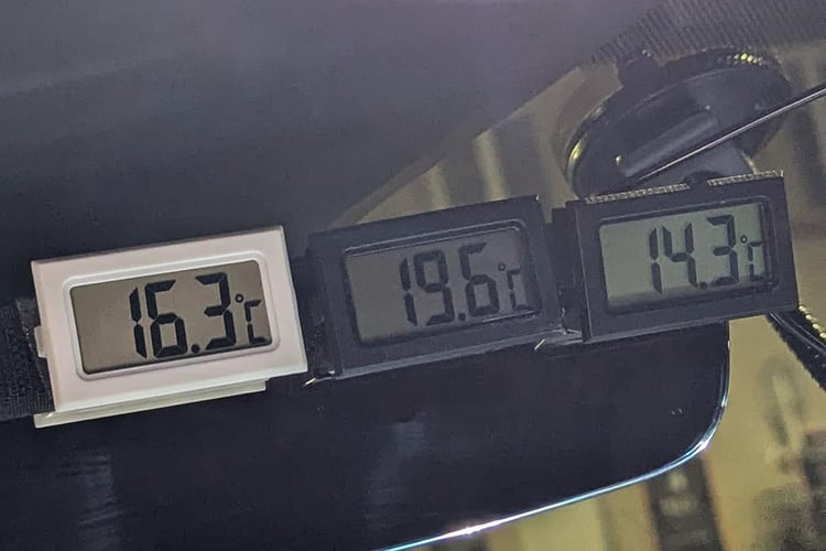 Afin de mettre toutes les voitures au même niveau, nous les équipons donc d’au moins trois thermomètres. La sonde placée à l’extérieur permet de contrôler en temps réel la température ambiante et son évolution. Installé entre les deux sièges avant à hauteur de la tête des passagers, le capteur intérieur doit afficher 20 °C (tolérance de +/- 0,5 °C). Enfin, la dernière, plantée dans une buse d’aération fonctionnelle, sert à contrôler la température produite par la climatisation. Seuls les deux premiers capteurs donnent le feu vert pour lancer les mesures. La dernière permet de vérifier que tout soit en ordre, ou les éventuels écarts de la climatisation sur le trajet. Le contrôle des conditions thermiques extérieures et intérieures est la clé pour mesurer avec précision la consommation des voitures électriques et cette méthode est une exclusivité Automobile Propre !