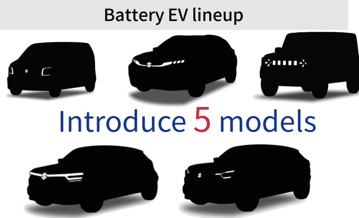 Dans la présentation du plan stratégique, Suzuki a montré les silhouettes des véhicules électriques prévus. Le premier sera un SUV compact, long d’environ 4,30 mètres, annoncé par le concept eVX. Pour le reste, on devine un petit véhicule façon kei-car japonaise, ce qui ressemble à une citadine polyvalente, d’autres SUV… et le Jimny.