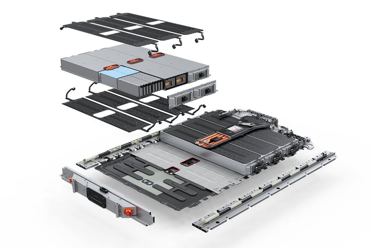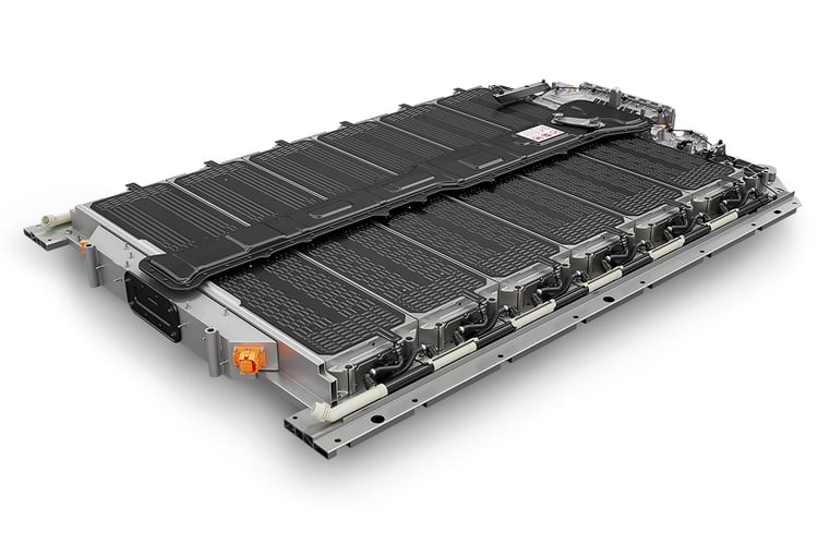 Le volet le plus intéressant de cette batterie concerne son refroidissement « sandwich ». Dit actif, il est assuré par un circuit avec des plaques collées de chaque côté d’un module. Extrêmement fines, elles permettent un refroidissement plus efficace des cellules. Voilà qui diffère des configurations habituelles, avec un très large circuit qui parcourt toute la surface du pack, d’un côté ou de l’autre. Les plaques sont alimentées par un circuit général latéral, qui distribue le liquide caloporteur via des petites durites en caoutchouc du côté droit et récupère le liquide chaud du côté gauche. Cependant, avec une telle configuration, la régulation thermique peut être compliquée, le liquide ne suivant qu’une seule direction. Pour pallier les problèmes, le circuit est asymétrique avec des canaux rectilignes du côté de l’entrée et un dessin en nid d’abeille du côté de la sortie. Le but ? Éviter au liquide d’emmagasiner trop de chaleur et de ne pas pouvoir refroidir efficacement les cellules au bout du circuit. Voilà qui permet selon nous d’uniformiser la dissipation de chaleur.