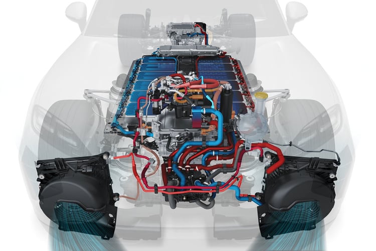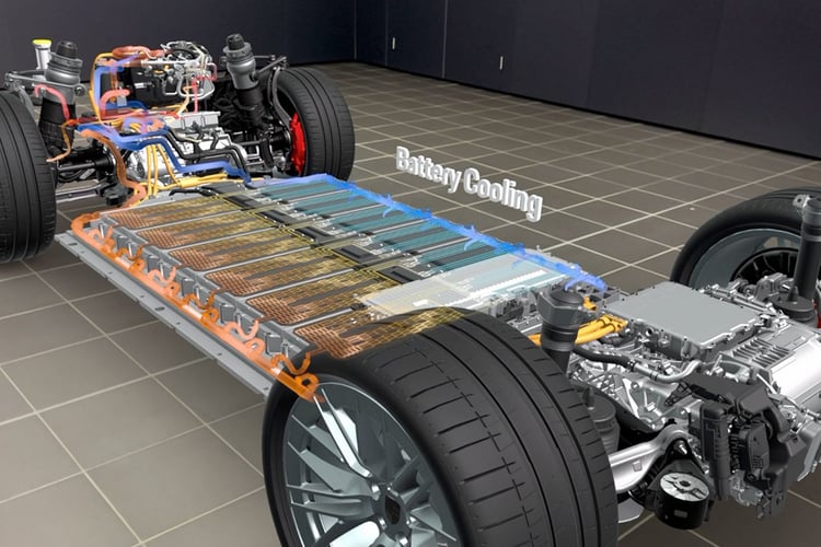 Le refroidissement est assuré par un système entièrement repensé, dont la puissance est équivalente à 100 réfrigérateurs selon Porsche. La performance du système de régulation thermique dépend notamment des ventilateurs déplacés à l’avant, dont la consommation serait inférieure de 15 % par rapport à des ventilateurs conventionnels. Porsche ne s’est pas attardé sur les vrais gains de ces choix techniques, et n’a pas été en mesure de nous communiquer la puissance maximale de la pompe à chaleur.
