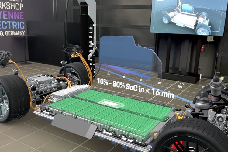 La batterie est l’une des plus grandes innovations du Porsche Cayenne Electric. D’une capacité brute de 113 kWh, pour 108 kWh nets, elle est composée de 192 cellules poches fournies par LG Chem, contre 396 unités dans la batterie Performance Plus de la Taycan. Dirk Britzen nous a indiqué que le choix a été effectué uniquement dans une optique de performance. Voilà pourquoi le Cayenne utilise des cellules poches au lieu de cellules prismatiques comme c’est le cas avec le Porsche Macan.