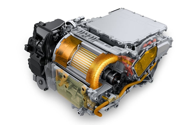 On retrouve à l’avant une machine à aimants permanents héritée du Macan, dotée d’un rotor de 210 mm et d’une longueur de 100 mm (il existe encore trois autres références). À l’arrière, le module est différent, et avec une unité spécifique pour la version Turbo. Celle-ci se distingue par la présence d’un système de refroidissement à huile au contact des fils de cuivre du stator. D’après Porsche, cette technologie issue de la Formula E et du GT4 e-Performance permet de dissiper la chaleur directement à la source. Ce système permettrait au bloc d’atteindre un rendement allant jusqu’à 98 %. De plus, cela permet de réduire le volume du bloc électrique : avec un système de refroidissement liquide conventionnel, qui utilise un circuit extérieur au stator, le module arrière devrait être 50 % plus volumineux pour fournir une performance thermique équivalente.