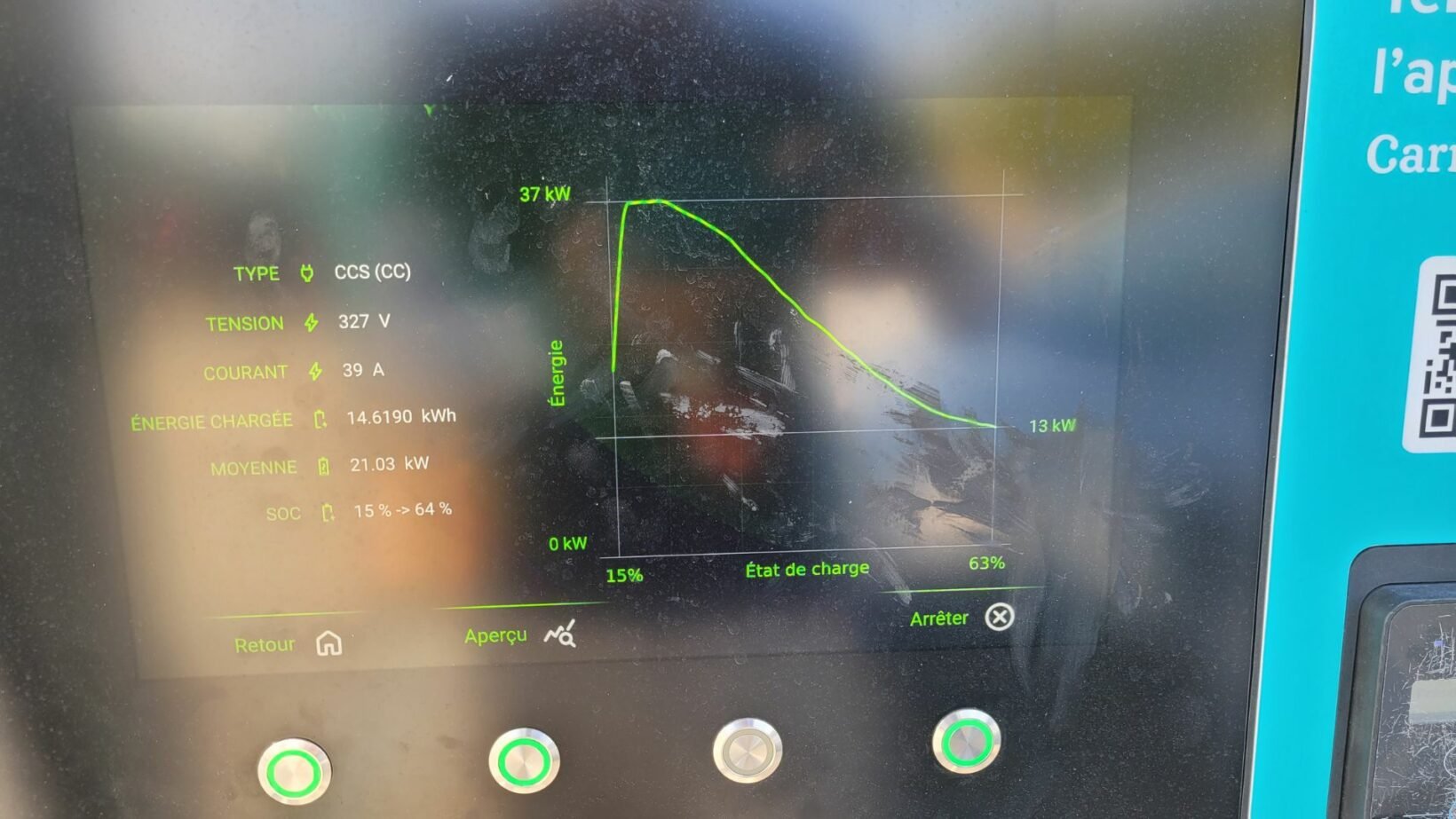 Mais le séjour tire déjà sur la fin et il est temps de rentrer du Phare Ouest vers le Grand Est, mais cette fois-ci en plein jour et avec des températures bien estivales. J’aimerais vous dire que le retour s’est passé aussi bien que l’aller, mais il n’en est rien. Petit déjeuner dans un McDonald’s du Mans pour la première recharge sur une borne Izivia aux excellents tarifs juste devant la porte d’entrée, puis, pour la seconde, déjeuner dans la galerie marchande d’un Carrefour à Saran équipée d’une station située sur son parking. Jusqu’ici tout va bien. C’est à nouveau chez Carrefour et Electra à La-Chapelle-Saint-Luc, près de Troyes, que se fera la troisième pause à l’heure du goûter, mais là, catastrophe.