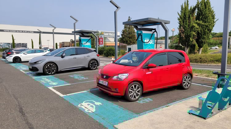 Vous n’êtes pas sans savoir que la batterie de la triplette Volkswagen est refroidie par air et non par eau, ce qui la rend sujette à la surchauffe lorsque l’on enchaîne plusieurs charges rapides. Vous pouvez trouver ce problème parfaitement documenté dans cette vidéo de La Chaîne EV, mais je pensais y échapper en empruntant la nationale et non l’autoroute, ce qui accorde un délai supplémentaire pour tempérer la pile qui est dans le même temps théoriquement moins sollicité. Et cela fonctionne dans une certaine mesure, puisque j’ai effectué un Strasbourg/Paris/Mulhouse/Strasbourg en 48 heures en décembre dernier ainsi que l’aller de ce périple sans la moins difficulté. Mais c’était forcément avec des températures hivernales dans le premier cas et de nuit et en grande partie sous la pluie dans le second. Et j’ai atteint les limites de ce que ma Mii pouvait encaisser sur le goudron brûlant de ce parking de supermarché en plein soleil, avec un thermomètre dépassant les 35 °C.