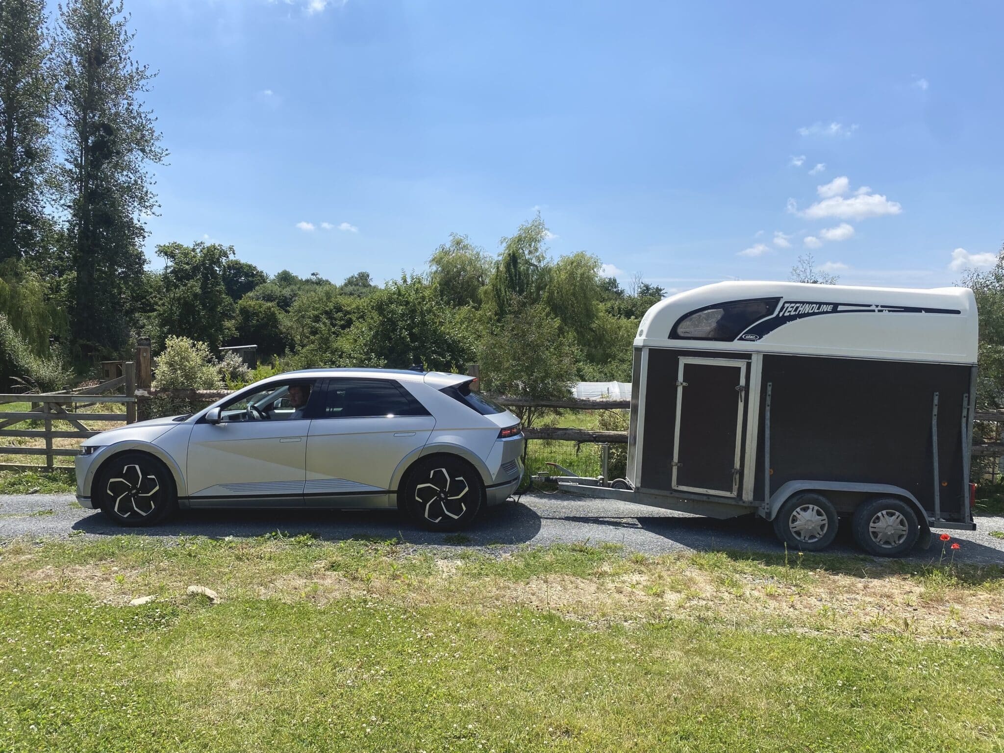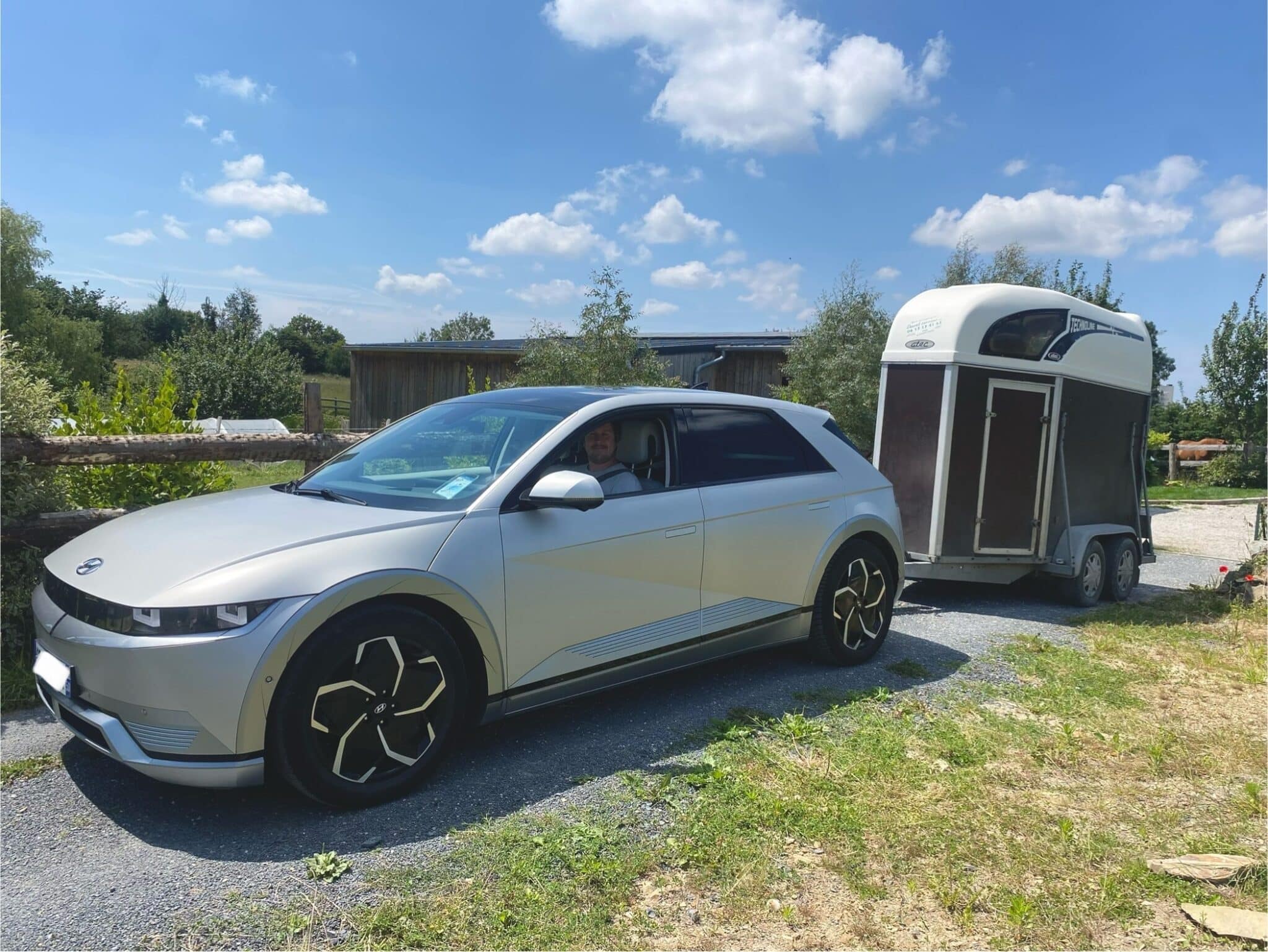 Équipé d’un attelage, le modèle a donc une capacité de traction de 1600 kg. C’est donc largement suffisant pour Maxime. Une fois chargé, son van ne dépasse jamais les 1 200 kg. Le kiné normand transporte régulièrement son cheval ou des moutons. La différence de consommation est toutefois assez impressionnante. Si sa Ioniq 5 offre habituellement une moyenne aux alentours de 17 kWh/100 km, avec le van, ce n’est pas du tout la même histoire. « En général, je suis plutôt aux alentours des 26 kWh/100 km avec le van et le cheval ».