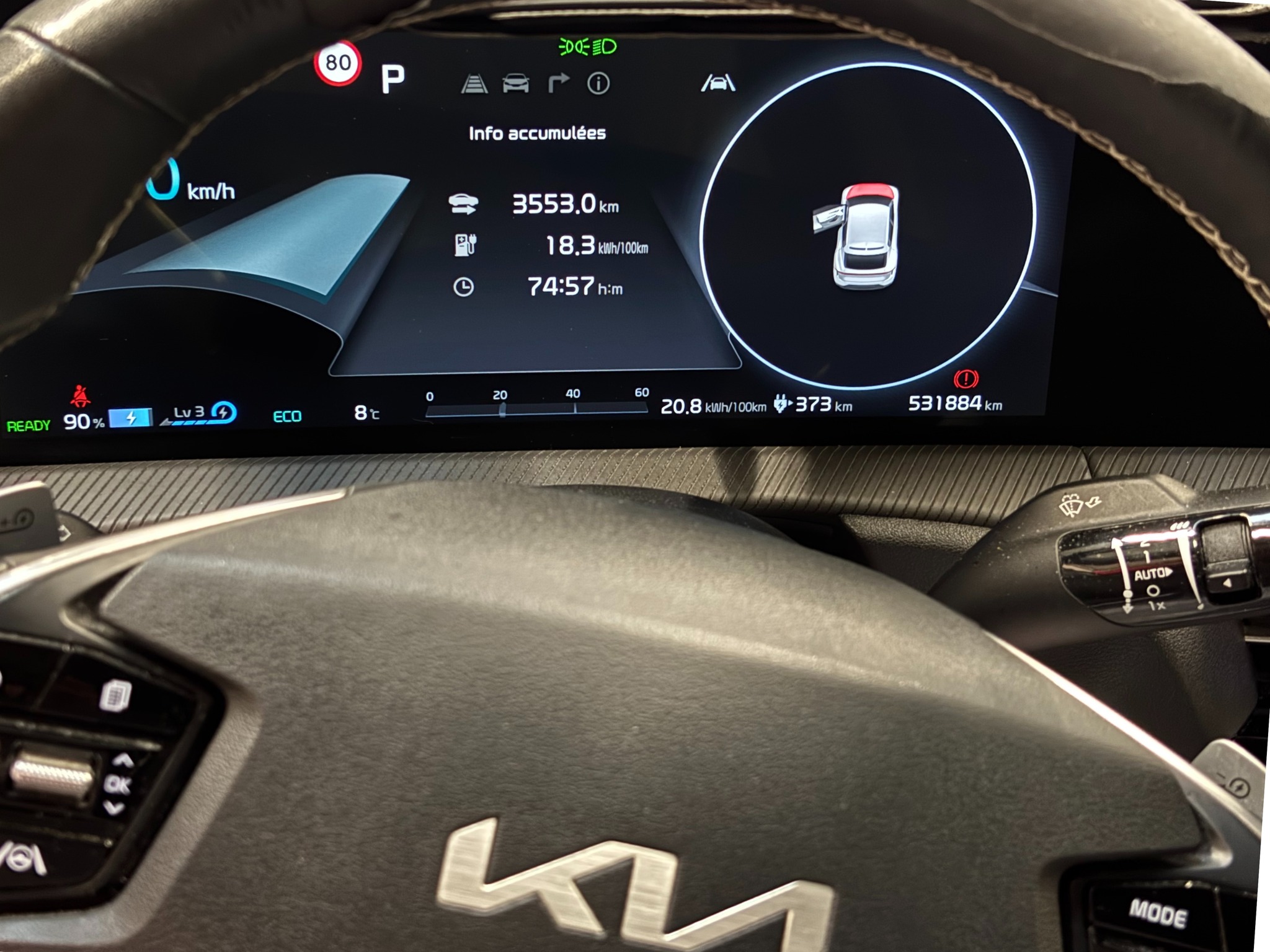 Mais c’est surtout l’état de santé de la batterie de cette Kia EV6 qui retient notre attention ! Sur ce sujet aussi, la désinformation va bon train. On entend parfois dire que la capacité des batteries se réduit drastiquement au fil des années. Pourtant, avec 530 000 km au compteur, l’autonomie réelle du véhicule de Pascal avoisine encore les 450 km. Un chiffre encore très proche des 528 km WLTP promis au moment de son achat.