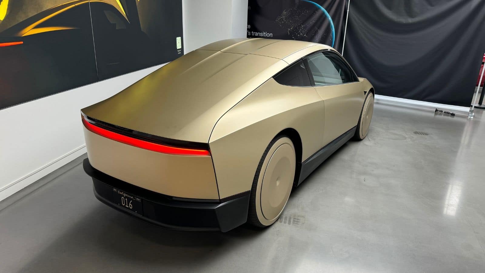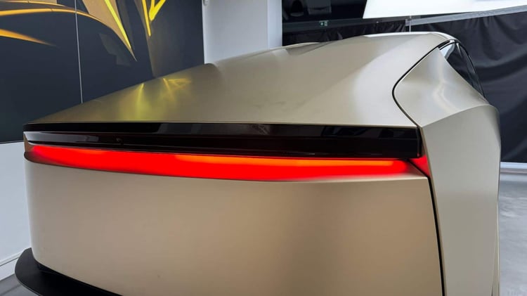 Avec celles de l’arrière paraissant plus grandes qu’à l’avant, les roues pleines et totalement recouvertes masquent les dimensions : « On est au moins sur du 20 si ce n’est du 21 pouces ». S’en dégage l’impression que la caisse est penchée vers la destination à atteindre. On aimerait deviner dans cette présentation une future compacte à conduire et aux dimensions européennes. A la façon d’un coupé, les lignes ne manquent pas d’élégance et de fluidité.