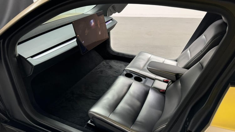 Puisque nous n’en sommes encore qu’au stade du concept, il est difficile de se prononcer sur la qualité de fabrication. Maxime Fontanier a cependant apprécié : « Tout est rembourré, comme souvent chez Tesla au niveau du mobilier ». Les sièges avec appuie-tête et avance réglable sont séparés par un double porte-gobelet et un accoudoir central qui peut se relever : « La sellerie est très confortable, mais on n’a aucun maintien. On est plus dans l’esprit canapé ».