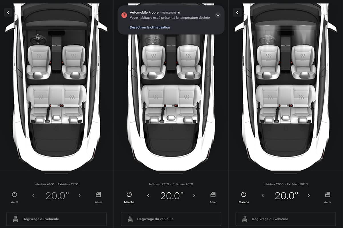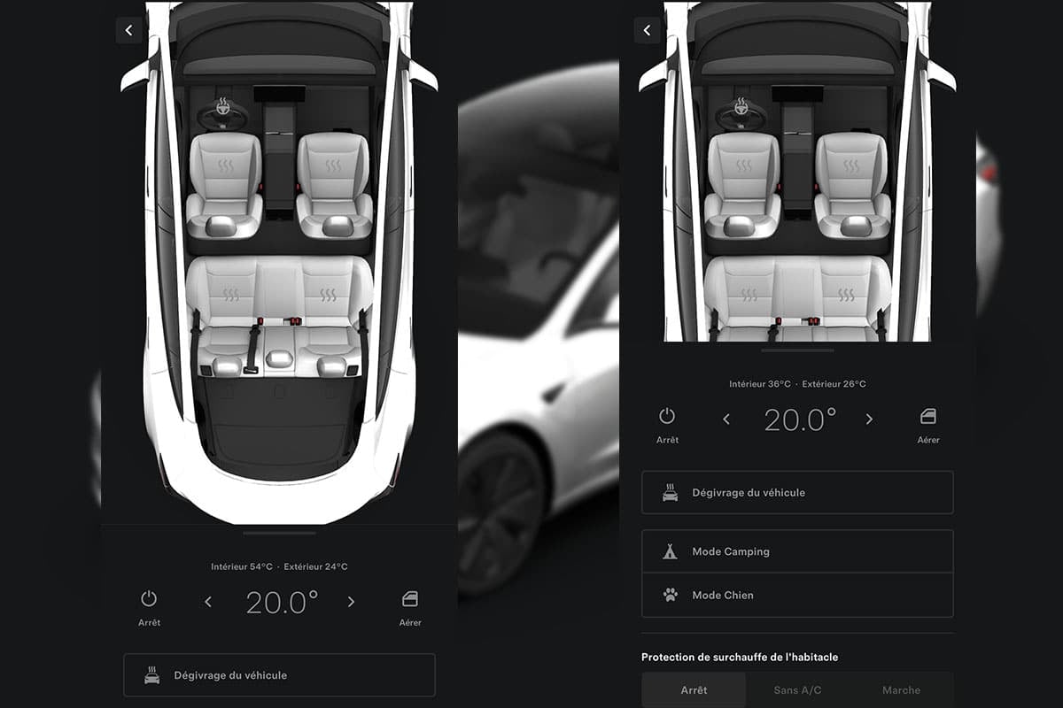 Les Tesla offrent plusieurs fonctions pour améliorer le confort thermique à bord. On y retrouve les modes Maintien, Chien et Camping. Leur fonctionnement est identique (cela permet de faire tourner la clim’ avec le véhicule à l’arrêt), mais ils proposent chacun des fonctions spécifiques. À ceux-ci s’ajoute aussi la fonction anti-surchauffe de l’habitacle. Une fois activé, ce système utilise automatiquement la ventilation ou la climatisation dès que l’habitacle dépasse les 40 °C, qui devrait correspondre à un habitacle aux alentours des 50 °C dans la réalité si l’on se réfère à nos mesures exclusives. D’après la notice, ce système peut fonctionner jusqu’à 12 h après avoir quitté le véhicule ou jusqu’à un taux de charge inférieur à 20 %. Côté consommation, cela dépendra donc des conditions.
