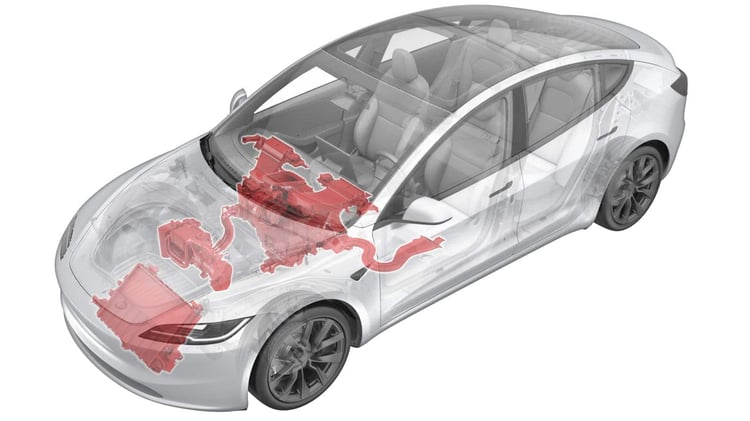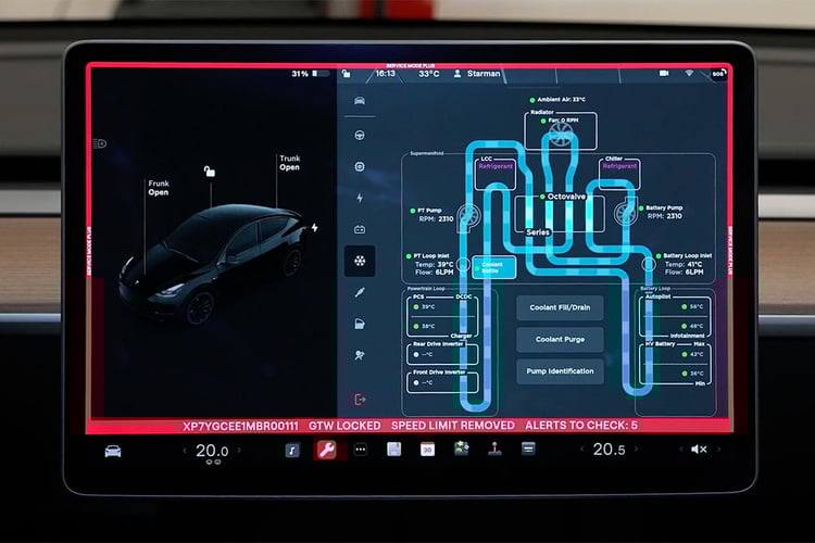 La logique est la même pour tous les systèmes, mais la forme peut changer, comme c’est le cas avec les Tesla, dont le circuit se distingue par l’Octovalve et son super-collecteur. Au centre du système de type pompe à chaleur, c’est elle qui gère les missions de refroidissement et de réchauffement des composants selon 15 modes de fonctionnement différents. Dans notre cas, seul un mode est utilisé. Il n’est donc pas nécessaire de se faire des nœud au cerveau avec les autres modes pour le moment. On aura l’occasion d’y revenir.