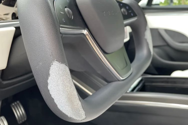 Les journalistes américains ont ainsi mis en avant l’état désastreux du volant de cet exemplaire, qui a été réservé 7 fois et qui affiche un peu plus de 19 000 miles au compteur, soit près de 31 000 km. On peut ainsi découvrir sur ces images un Yoke complètement déchiré, aux endroits où se posent naturellement les mains sur ce volant (nous conseillons toutefois de les poser sur la partie haute).