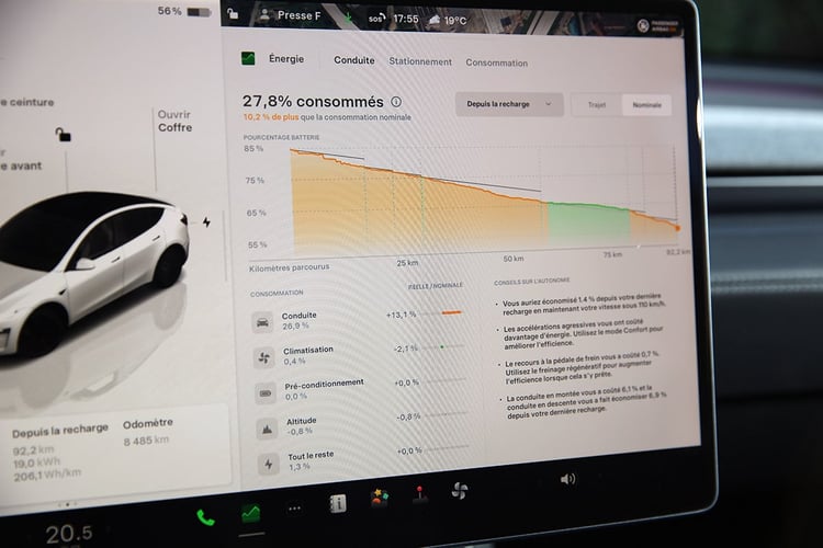 Avec une batterie à 17 °C au départ, la batterie LFP a besoin de 38 minutes pour atteindre la température cible de 42 °C, contre une consommation totale de 4,0 kWh, soit 7 % de charge au tableau de bord. C’est excessif, mais le gain de temps est avéré (voir plus bas). En phase de roulage, la consommation est évidemment moins importante, et nettement plus représentative de l’utilisation normale du système. Toujours avec une batterie froide au départ (17 °C), nous avons calculé une consommation de 2,6 kWh (4,3 % selon le compteur dédié), pour un cycle complet d’une durée de 36 minutes. Avec une batterie à 22 °C au départ, un air à 20 °C et une vitesse moyenne plus élevée, le cycle a siroté 1,4 kWh (2,4 %) et 37 minutes.