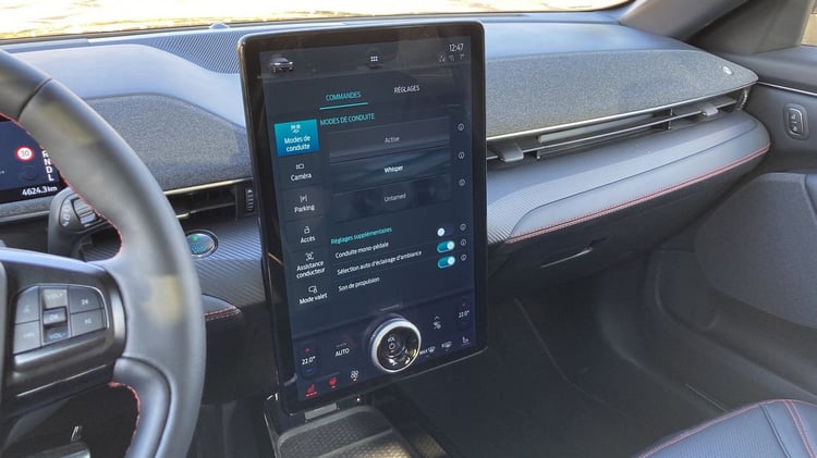Contrairement au Model Y, qui confie l’intégralité des fonctionnalités à son large écran central, Ford a choisi de conserver le classique écran d’instrumentation derrière le volant. Les indications sont à la fois claires et lisibles. Installé en position verticale, le grand écran central est impressionnant. Tactile, il intègre dans sa partie basse une molette permettant de régler le volume et de naviguer plus facilement entre les différents menus.