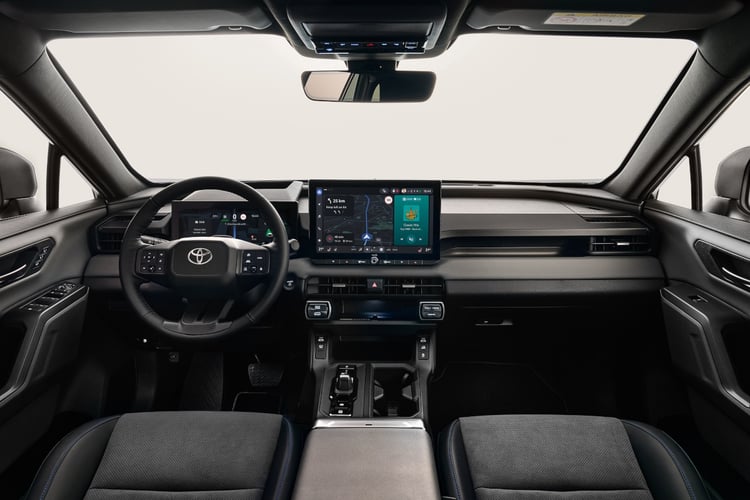 À l’avant, le poste de conduite est entièrement remanié et marque une logique rupture avec la précédente mouture lancée en 2018. On y retrouve une ambiance très américaine avec des formes cubiques et une large console centrale. L’ambiance est fidèle à l’esprit Toyota, mais l’ensemble gagne en charisme. En revanche, les graphismes projetés sur l’instrumentation de 12,3 pouces ou sur l’écran tactile central de 12,9 pouces demeurent inchangés et se montrent toujours très simples.