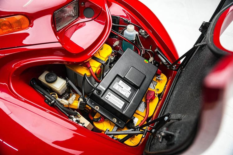 Cependant, cet exemplaire rutilant fabriqué en 2000 ne peut plus rouler en raison d’une batterie HS. Celle-ci est composé de 13 batteries au plomb branchées en série (pour une tension de 156 V). Un bricolage s’impose donc, ou il faudra tenter de mettre la main sur une pile au lithium, comme celles utilisées par Myers Motors à partir de 2009, portant ainsi l’autonomie à près de 100 km.