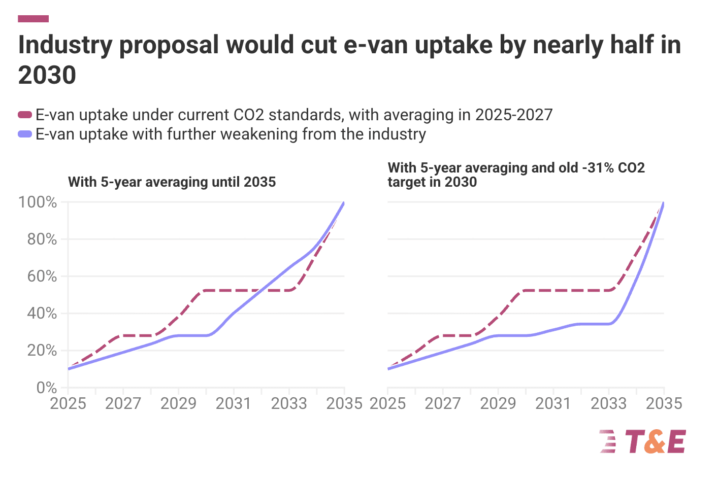 Mais les experts de Transport & Environment alertent : céder à ces pressions risquerait de freiner la transition écologique d’un segment clé du transport routier. Selon lui, les ajustement réclamés par l’ACEA signifieraient une chute brutale du nombre d’utilitaires électriques sur les routes. Selon les projections, seuls 28 % des nouveaux modèles vendus en 2030 seraient électriques, contre 52 % avec la réglementation actuelle
