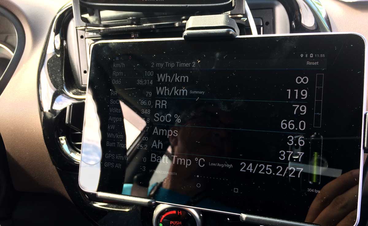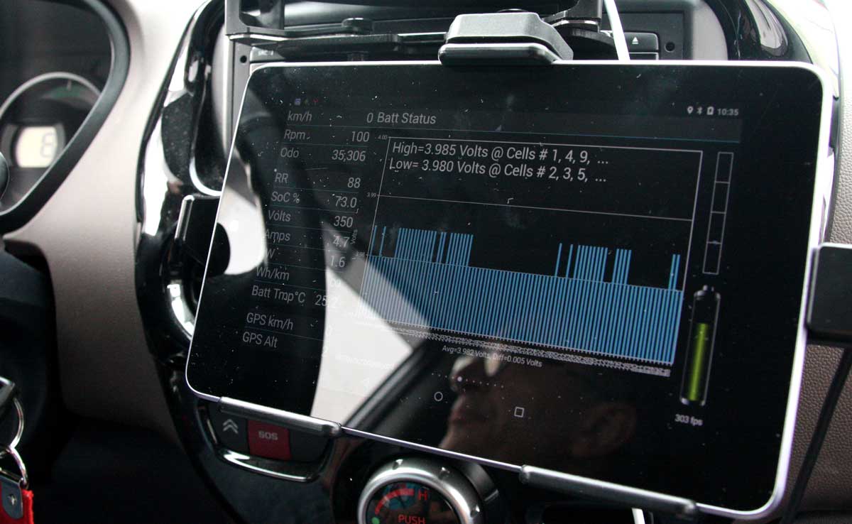 Avec quatre écrans installés, l’ami Jérôme a transformé sa C-Zero en véritable centre de contrôle. L’un d’entre eux, reposant sur une tablette liée au système CAN de la voiture, nous a particulièrement interpellé. Baptisée CaniOn et développée par un français, Xavier Moya, l’application a été spécialement conçue pour la « triplette » (Peugeot iOn, Citroën C-Zero et Mitsubishi i-MiEV) et vient récupérer toutes les informations liées à la batterie.