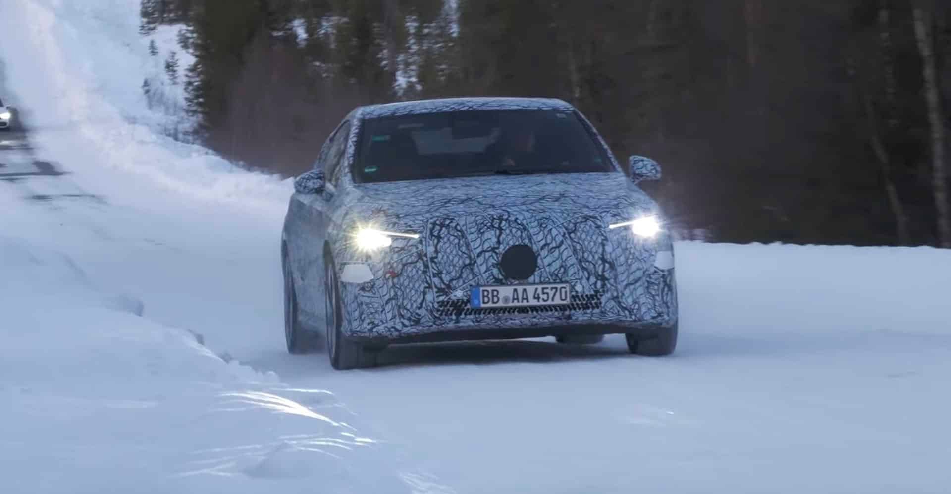 Dévoilée sous forme de concept au salon de Munich 2023, la CLA électrique a été aperçue au nord de la Norvège, en tenue de camouflage. Elle pose les bases de la future famille d’entrée de gamme chez Mercedes.