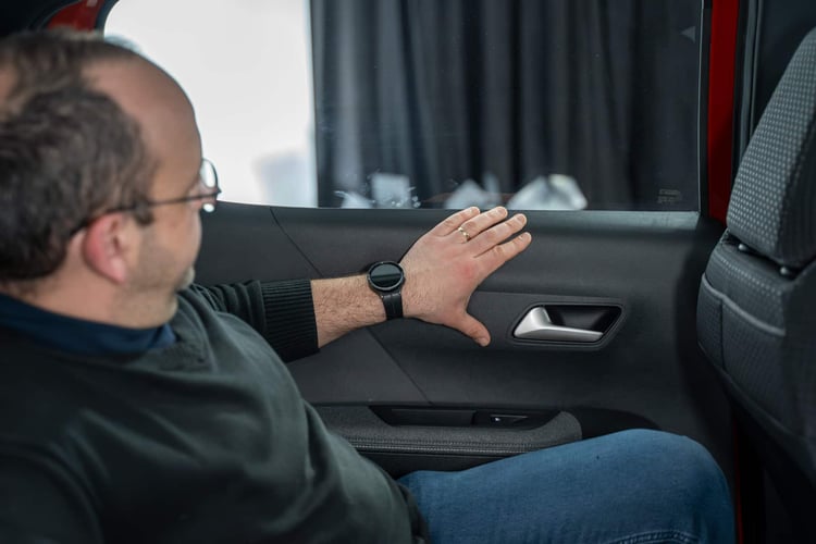 À l’arrière, l’espace aux jambes est assez surprenant. Avec le siège avant réglé pour notre position de conduite (1,75 mètre) il nous reste un peu moins de 10 cm aux genoux notamment en raison de la conception des sièges de devant qui sont creusés au centre. Mention spéciale pour le choix des tissus de notre modèle de présentation. Les motifs ajoutent un certain cachet et, surtout, on aime les petites pochettes en position haute qui pourront accueillir un smartphone, par exemple. La hauteur de garde au toit est très bonne et les sièges des places 3 et 4 sont légèrement creusés pour contribuer quelque peu au maintien latéral. Comme toujours, la place du milieu est moins confortable. À noter également que sur ce véhicule, qu’on imagine proposé à un tarif assez abordable, il faut se contenter d’habillages de contre-porte en plastique qui ont au moins le mérite d’être faciles à nettoyer et plutôt bien assemblés.