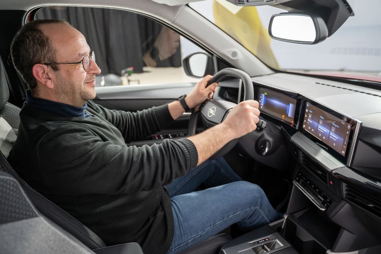 Le constat est le même à l’avant, avec une planche de bord faisant, elle aussi, massivement appel aux matières plastiques. On sait qu’Opel met en avant l’utilisation de matériaux recyclés, y compris dans les tissus. Conducteur et passager profiteront d’une impression d’espace tout à fait confortable, et d’une assise de qualité. Les sièges Intelli Seat de notre modèle de présentation sont agréables et on apprécie la conception aux couleurs multiples qui apporte un peu de gaieté à l’habitacle. Mention spéciale pour le ciel de toit qui est blanc et non pas noir comme c’est souvent le cas. Une excellente chose, car outre le fait d’être plus lumineux — mais plus salissant aussi — il permettra sans doute au passager de se sentir un peu moins “oppressés”.