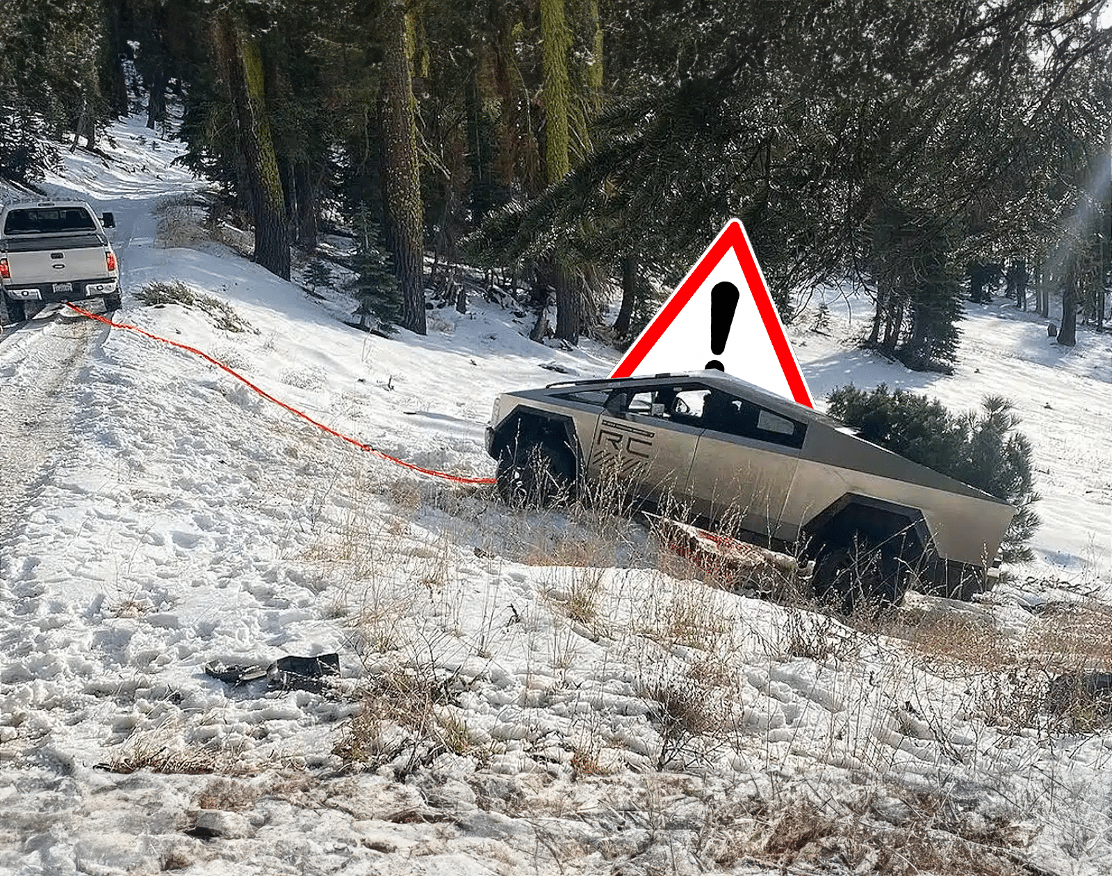 Quelques détails supplémentaires ont été révélés et permettent de comprendre précisément ce qu’il s’est passé. Bloqué sur le flanc d’une colline et malgré le fait qu’il soit tracté par un Ford F-150, on voit bien que les pneus du Cybertruck n’arrivent pas à accrocher sur la neige. Un terrain glissant, d’accord, mais pas non plus une situation extrême. Un pick-up comme le Cybertruck devrait pouvoir largement s’en sortir si on en croit sa fiche technique.