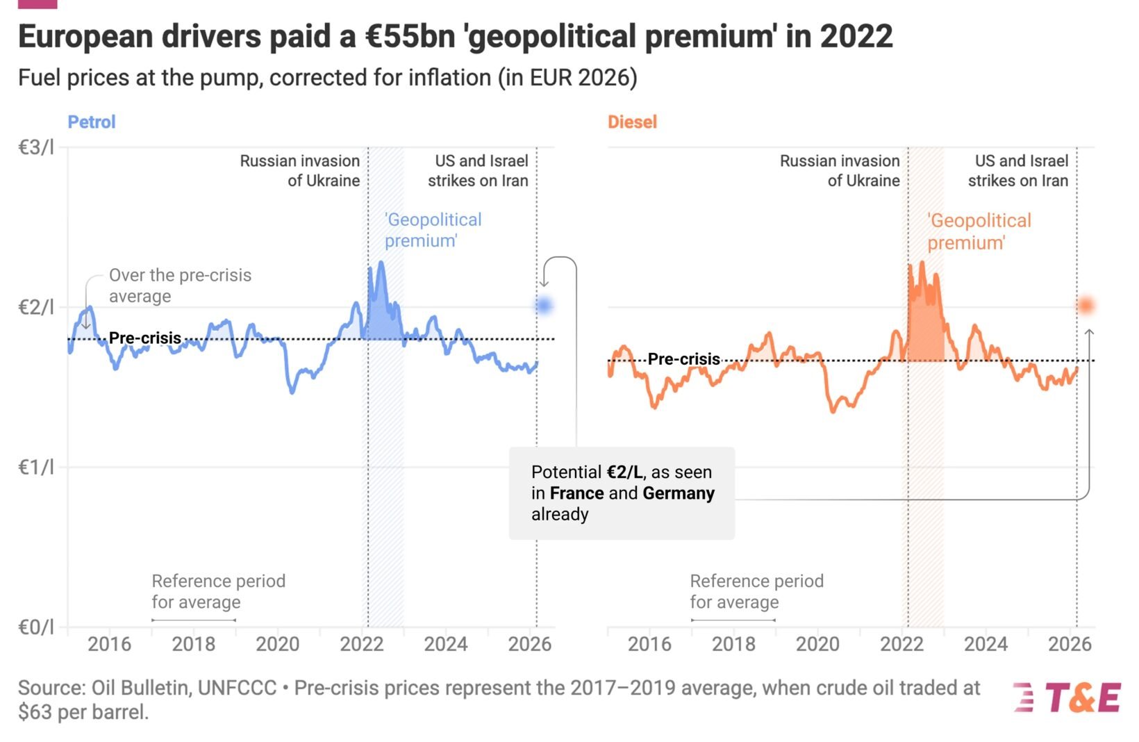 L’organisation rappelle que la dépendance de l’Europe aux importations de pétrole continue d’exposer l’économie et les ménages aux chocs géopolitiques. T&E s’appuie sur l’exemple récent de 2022, lorsque les prix du pétrole avaient déjà franchi la barre des 100 $ le baril. Cette année-là, les automobilistes européens ont payé 55 milliards d’euros supplémentaires à la pompe, une somme que l’ONG qualifie de « prime géopolitique ».