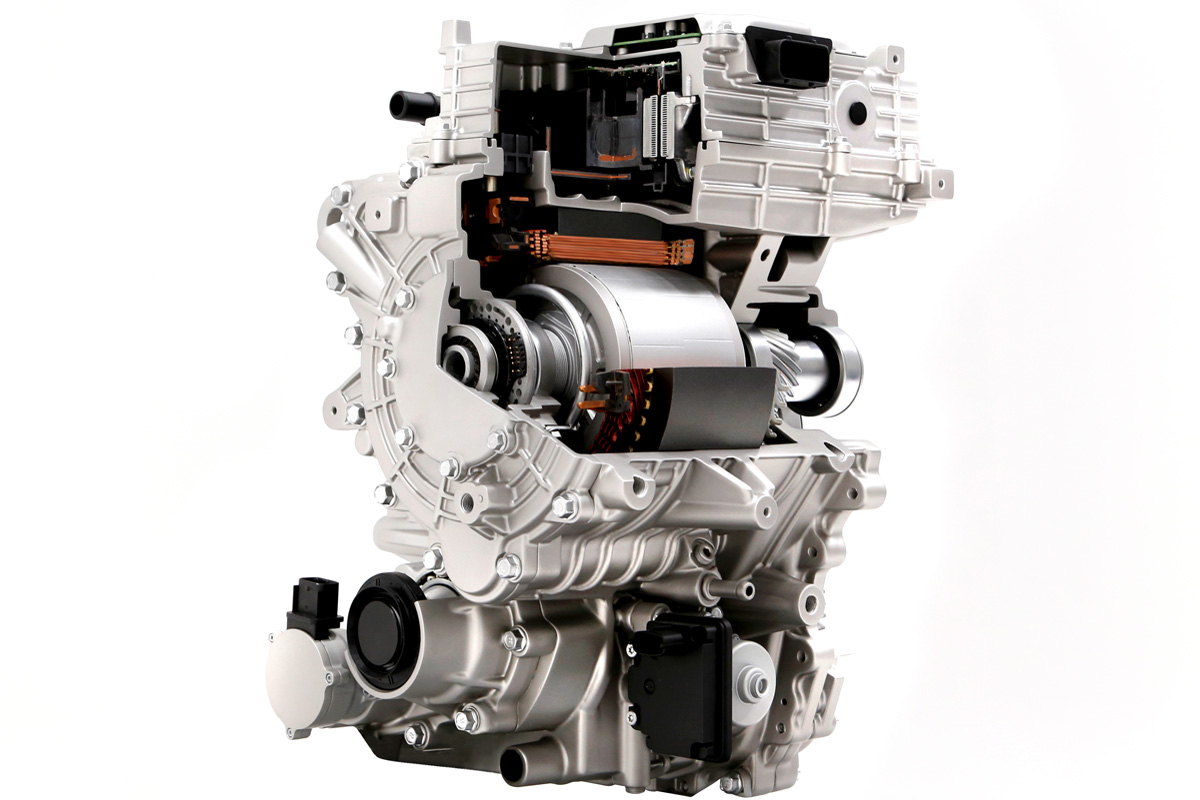 Le train de roues avant reçoit le nouveau bloc compact « Power Electric » qui rassemble un puissant moteur électrique, un système de transmission et un onduleur dont le module d’alimentation utilise des semi-conducteurs en carbure de silicium (SiC).