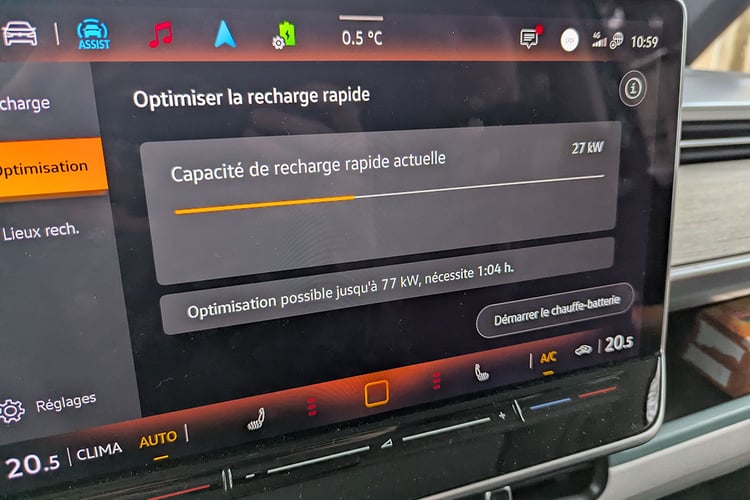 Une batterie trop froide peut aussi entraîner une surconsommation inévitable en hiver. Pour délivrer les meilleures performances, certaines batteries disposent d’un système de régulation thermique réchauffant un peu plus vite les cellules en roulant. Le système existe, mais nous n’en avons jamais observé ni chiffré ce type d’activité. A contrario, le préconditionnement avant une recharge rapide est davantage utilisé en hiver. Mais la consommation du système n’est pas aussi importante que l’on croit : on compte en moyenne une consommation de 1,6 kWh pour un gain de 10 °C dans la batterie. Autre point de vue avec nos mesures réalisées lors de notre Supertest 0 °C du Skoda Elroq : sur un trajet autoroutier de 500 km par 0 °C, l’utilisation du préconditionnement avant les deux pauses recharge se traduit par une surconsommation de 0,8 kWh/100 km à la fin du trajet. Soit à peine 10 km d’autonomie totale en moins. Notons ici que le préconditionnement permet d’accélérer le temps de recharge rapide, mais là encore, les gains ne sont pas aussi significatifs sur le 10-80 %. Voici un exemple d’un cycle de préconditionnement avec le Skoda Elroq.