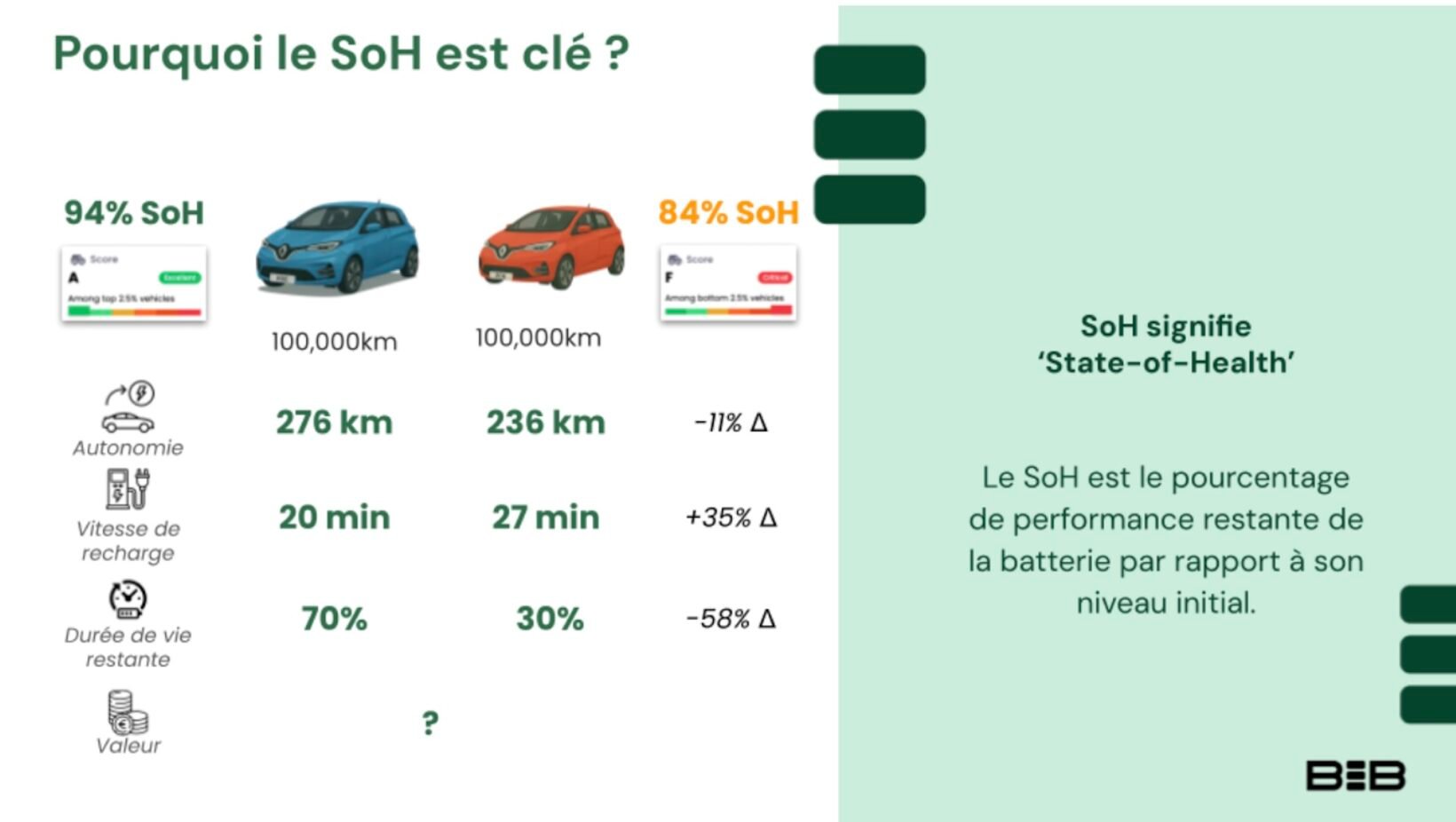 Les auteurs du rapport prennent exemple sur la Renault Zoé. Ils comparent deux modèles similaires avec 100 000 km au compteur. On constate qu’un SoH de 94 % garantit encore plusieurs années de circulation sereine, avec une recharge rapide et une autonomie stable. À l’inverse, une batterie descendue à 84 % de SoH peut déjà souffrir de lenteurs à la recharge et d’une autonomie réduite. Pourtant, ces véhicules en apparence proches sont souvent proposés au même prix sur le marché de l’occasion.