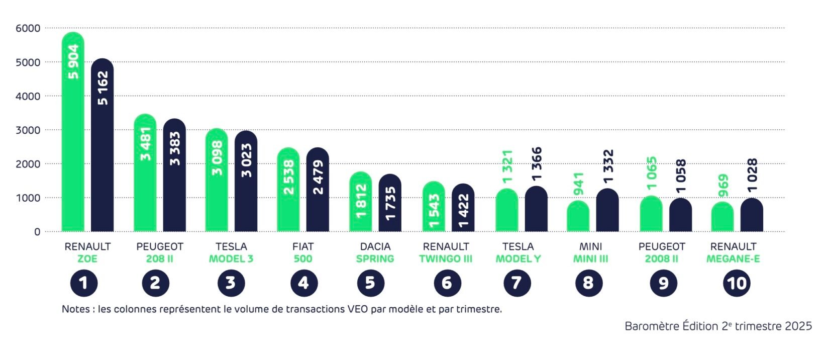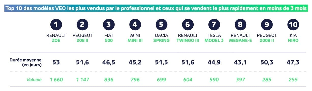 D’après vous, quels sont les modèles électriques qui se vendent le mieux en occasion ? Mobilians et l’Avere-France viennent de publier leur traditionnel baromètre qui nous permet de répondre à cette question. Au cours des trois derniers mois (avril-juin), c’est une fois de plus la Renault Zoé qui est arrivée en tête des ventes avec 5 162 exemplaires vendus. Ensuite on retrouve les Peugeot e-208, Tesla Model 3, Fiat 500e, Dacia Spring, Renault Twingo, Tesla Model Y, Mini Cooper, Peugeot e-2008 et Renault Megane E-Tech.