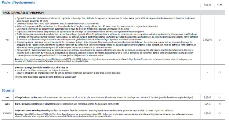 Quant à la partie purement électrique, la pompe à chaleur est facturée 1020 euros et promet de limiter la perte d’autonomie en hiver. Volkswagen également des solutions pour la recharge domestique en partenariat avec Proxiserve avec deux offres identifiées : la prise Green’Up pour la charge jusqu’à 3.2 kW avec une offre débutant à partir de 475 euros et une borne Schneider pour les charges allant jusqu’à 7.2 kW (à partir de 1250 euros).