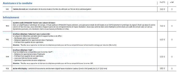 Sur la partie sécurité, le constructeur propose notamment un pack Drive Assist Premium qui, pour 1020 €, ajoute l’alerte de franchissement de ligne, le détecteur d’angle mort, la reconnaissance des panneaux de signalisation, l’allumage automatique des feux de route ou le système d’assistance au stationnement en créneau et en bataille. Parmi les autres options figurent le pack hiver (650 euros), incluant les sièges chauffants, le système de verrouillage/déverrouillage sans clé (415euros), la caméra de recul (260 euros) ou l’instrumentation digitale Active Info Display (580 euros).