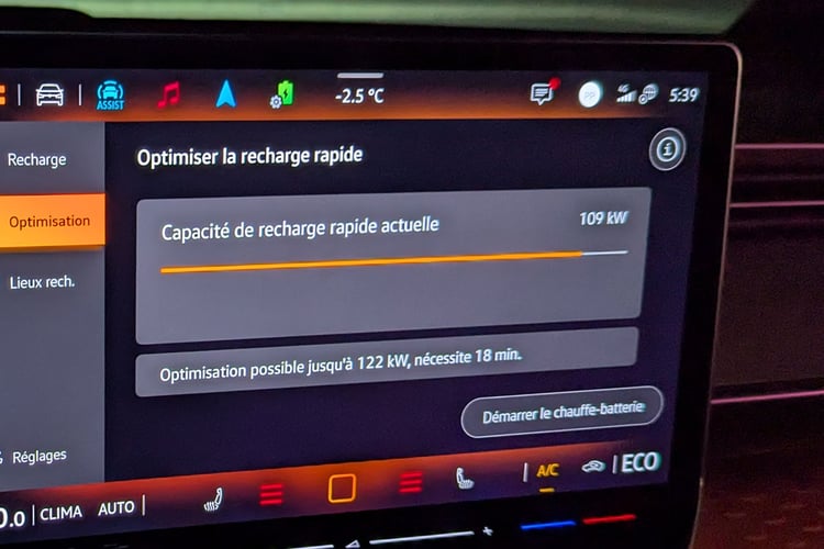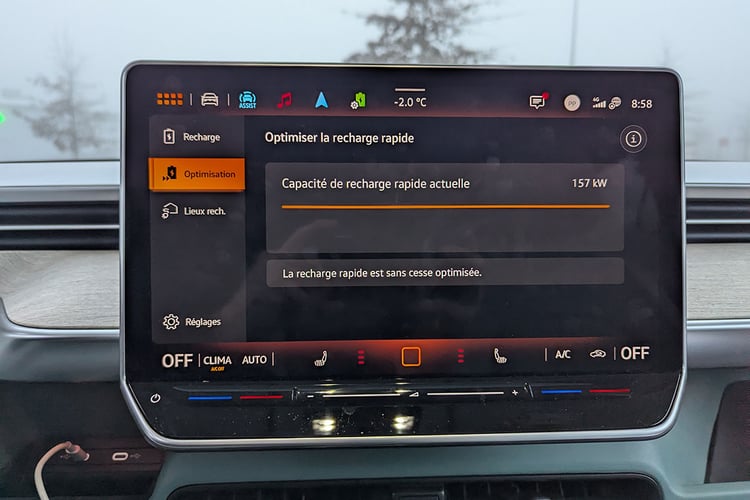 Au moment de débrancher à 80 %, la batterie préalablement préchauffée atteint les 46 °C. Après un trajet autoroutier de près de 180 km (1 h 30) par une température extérieure de -1,5 °C, la batterie n’est tombée qu’à 18 °C. D’après le menu Optimisation, 18 minutes de préconditionnement sont nécessaires pour faire passer le pic de puissance de 110 à 122 kW. Résultat : le 10-80 % ne réclame ici que deux minutes de plus par rapport à une optimisation préalable.