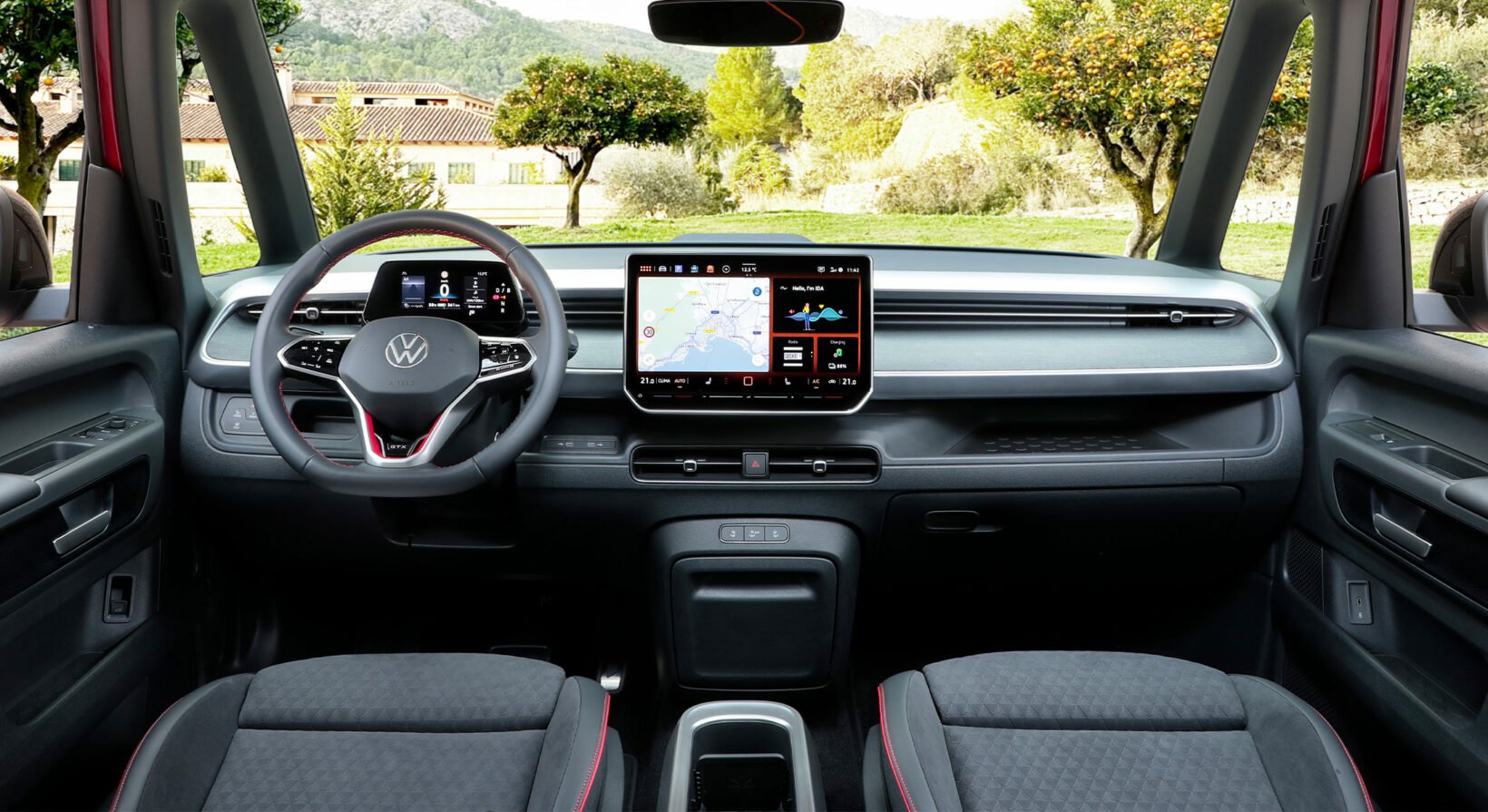 Comme les autres modèles de la gamme GTX que nous vous avons présentés récemment (ID.7 GTX Tourer et ID.3 GTX) dans nos colonnes, l’habitacle de ID.Buzz est désormais composé de matériaux certes de qualité, bien assemblés, mais dans un choix de coloris assez sombres. Précisons toutefois que ce modèle à destination, d’une certaine manière, des baroudeurs, fait appel à plusieurs éléments en plastique, disposés aussi bien en partie haute de la planche de bord, que dans les panneaux de contre-porte.