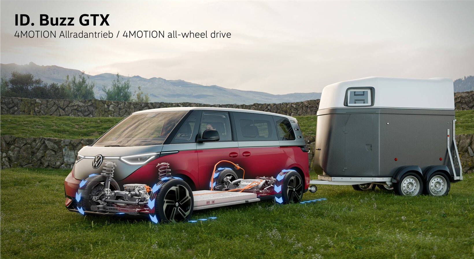 Une plateforme plutôt performante sur le papier, à transmission intégrale appelée « 4Motion » chez Volkswagen, qui présente un autre avantage : celui de pouvoir tracter de plus lourdes charges. Le constructeur annonce jusqu’à 1 800 kg avec freinage en pente jusqu’à 8%. Plus exactement, l’ID.Buzz GTX peut tracter jusqu’à 1800 kg en version courte 5 places et jusqu’à 1600 kg en version longue 7 places. Une augmentation pour ces deux versions qui est respectivement de 800 et 600 kg, c’est considérable ! Nous avons pu éprouver le système d’attelage sur place et, sans grande surprise, tout est plutôt bien pensé. Un bouton de déverrouillage est accessible sur le flanc gauche à l’intérieur du coffre.