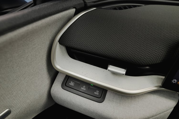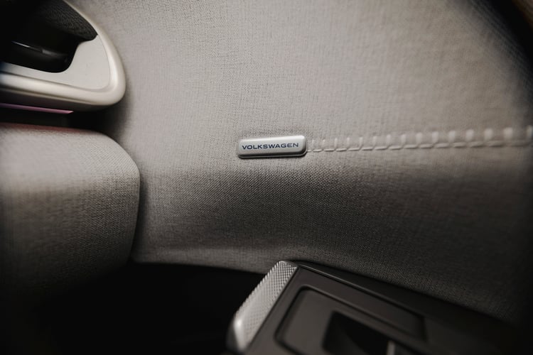 Une autre tendance, plus récente, est aussi visible : VW fait la part belle au tissu pour les habillages. Cette matière, qui commence à remplacer le plastique moussé, habille un bandeau de la planche de bord et une bonne partie des portes. A noter que le tissu est mis en avant avec de l’éclairage d’ambiance. Les poignées pour ouvrir ces dernières sont intégrées au bout de l’accoudoir, sous forme d’un levier qui se soulève dans un mouvement plus naturel.