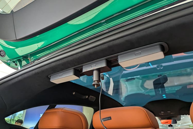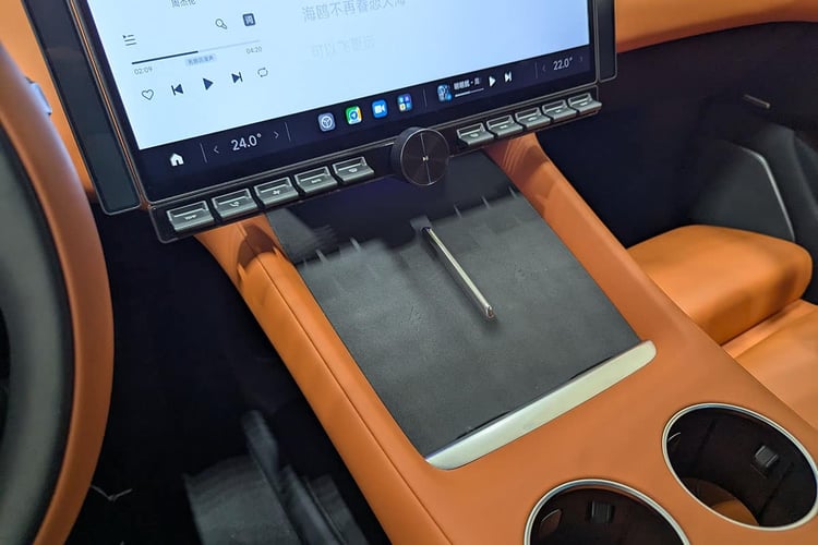 Toujours à bord, le Xiaomi YU7 propose de nombreuses fixations pour ajouter des accessoires de la marque. On y retrouve des supports pour smartphones avec recharge sans fil (le SUV dispose par ailleurs d’un double chargeur à induction à l’avant) ou pour tablettes à l’arrière. Voire un rail derrière la tête des passagers arrière pour venir fixer des éclairages additionnels ou des supports de caméra. On a même retrouvé au plafond des touches amovibles qui, dans notre cas, permettent d’effectuer une photo de l’environnement en face de la voiture. Une fois l’image enregistrée, le système permet d’identifier les objets comme le ferait Google Lens. La qualité de la caméra est d’ailleurs au rendez-vous, tout comme celle de l’affichage de l’écran central. Plutôt rapide, il se révèle tout aussi intuitif que d’autres systèmes déjà connus. Preuve en est : nous avons pu accéder aux menus essentiels sans changer la langue d’origine (et sans en comprendre un mot, bien entendu).