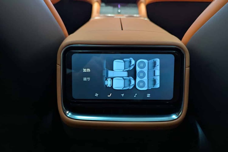 À l’intérieur, toujours, le gigantesque empattement de 3,00 m libère une place généreuse à bord. Mais elle n’est pas aussi royale qu’à bord de quelques SUV concurrents. Si les passagers avant disposent de sièges pouvant être allongés en position couchette, les occupants arrière ne sont pas en reste. Les différentes fonctions de confort sont d’ailleurs pilotables depuis l’écran arrière, tout aussi réactif et intuitif que celui posé à l’avant. Seul grief : le plancher nous est un peu surélevé, obligeant à remonter les genoux.