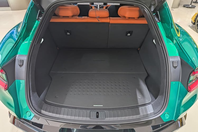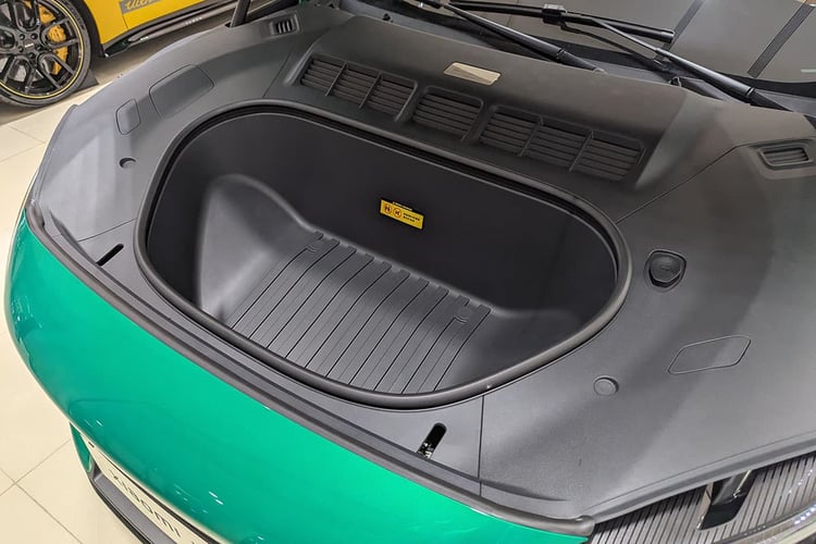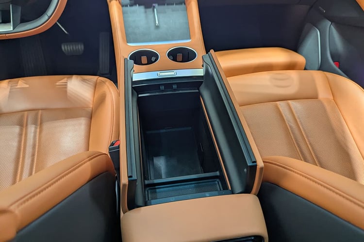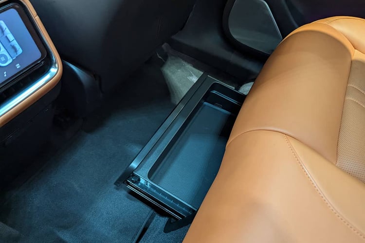 Enfin, côté pratique, le Xiaomi YU7 se situe dans la bonne moyenne. La console centrale avant cache un grand vide-poche et un vaste rangement inférieur. À l’arrière, si les poches aumônières manquent, un tiroir prend place sous la banquette. Le coffre, au demeurant correct pour une famille, n’apparaît pas aussi gigantesque que les 678 l annoncés le laissent penser. D’autant que la découpe du pavillon pourrait limiter l’emport de grands objets. On trouve en revanche sous le plancher en deux parties un profond bac. Celui-ci peut être secondé par le frunk de 141 l qui, là encore, ne semble pas faire sa taille, mais se révèle suffisamment spacieux pour l’usage qui en est fait habituellement.