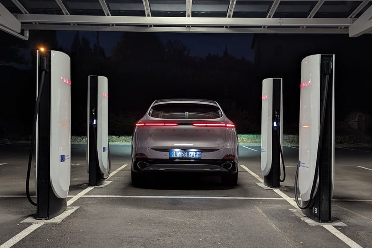 D’autre part, et c’est aussi logique, la borne doit être capable de délivrer plus de 450 kW, mais celles-ci sont très rares. D’après le dernier baromètre de l’Avere France, seuls 3 978 points de recharge sont susceptibles de débiter plus de 350 kW, contre 16 382 unités avec une puissance comprise de 150 à 350 kW. Mais prudence : encore faut-il que la tension de fonctionnement soit suffisante pour pouvoir lancer la recharge. Ce qui n’est pas le cas des Superchargeurs Tesla, qui promettent 250 kW sous tension 400 V. Voilà qui réduit donc les chances de pouvoir atteindre la puissance et le temps de recharge promis par la brochure. Nous avons donc décidé de mener l’enquête pour chiffrer les différences de temps selon la puissance de la borne dans le monde réel. Et on a eu de nombreuses surprises !
