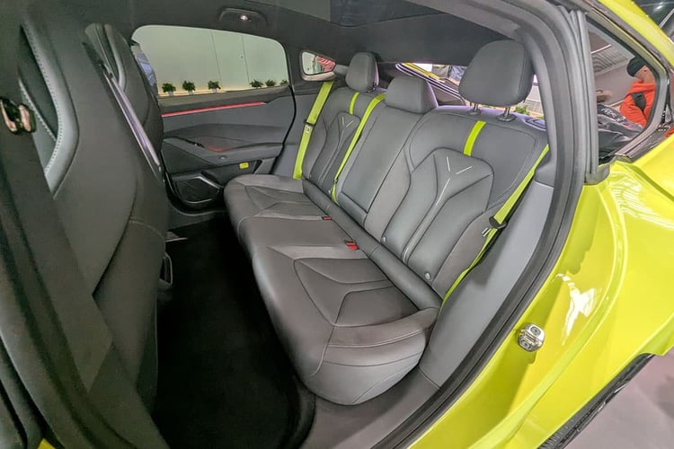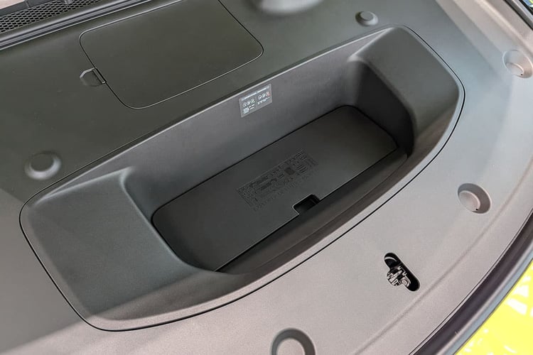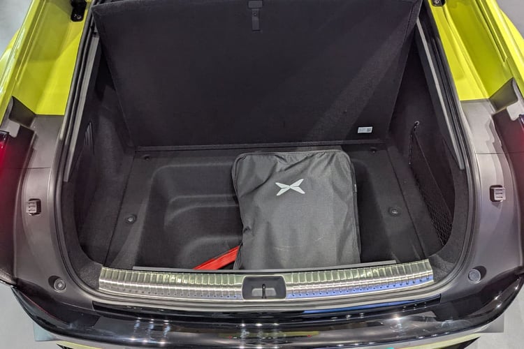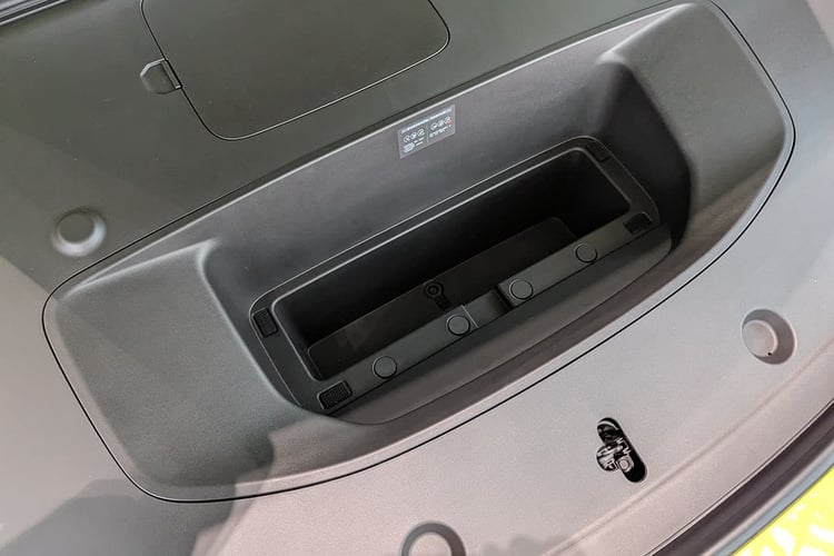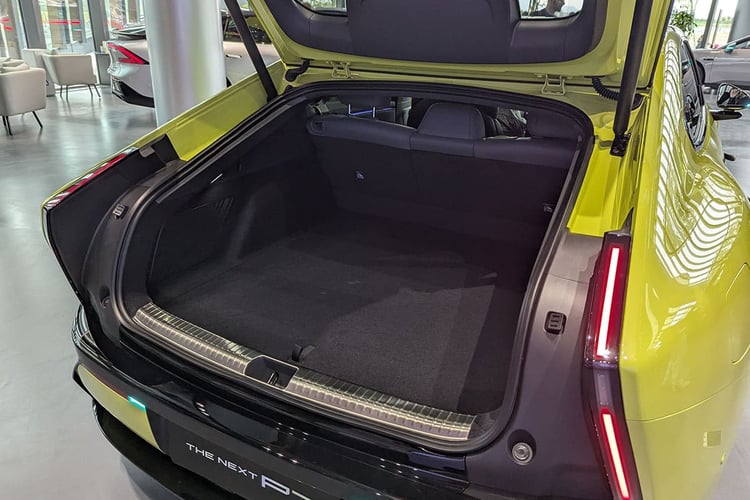 À l’arrière, le hayon s’ouvre sur un coffre annoncé avec un volume de 575 l. La valeur est correcte, mais la marque prend en compte le profond bac sous le plancher d’un seul tenant. Le volume utile, lui, est plutôt étriqué et ne semble pas pouvoir rendre de meilleur service que la soute de 502 l de la Lotus Emeya. Comme cette dernière, la P7 propose un funk d’une capacité similaire de 56 l. L’effort d’utiliser l’espace est là, mais il ne servira que pour dépanner.