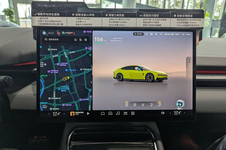 Comme de coutume, on fait face à un large écran tactile central de 15,6 pouces qui regroupe toutes les commandes de bord avec, là encore, une organisation identique. On y retrouve toutefois un menu dédié à la conduite dynamique, affichant des informations sur la condition des pneus Michelin Pilot Sport EV ou sur les accélérations latérales et longitudinales. Petite particularité aussi : cet écran peut pivoter vers l’un ou l’autre des passagers avant en glissant les quatre doigts sur la dalle. Lorsque la vue 360° est activée, il s’oriente automatiquement vers le conducteur. Dommage que les autres modèles de la gamme, y compris ceux proposés chez nous, n’en profitent pas ! Même chose pour l’affichage tête-haute 3D. En revanche, si elle est amusante, la fonction qui consiste à jeter virtuellement des émoticônes sur les autres usagers n’est pas tellement indispensable.