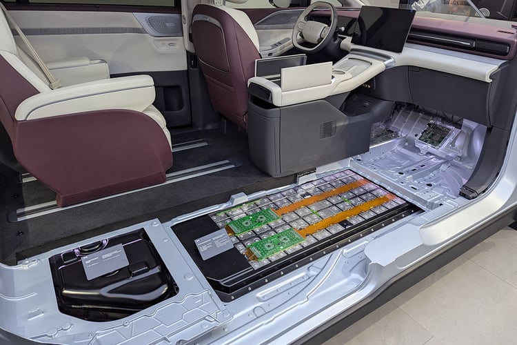 Au rayon électrique, le XPeng X9 met la barre très haut. Voire, sans doute, beaucoup trop haut pour une voiture hybride rechargeable. La batterie LFP d’une capacité de 63,3 kWh est dite 5C, et est donc capable de réaliser le 10-80 % en moins de 12 minutes sur une borne de recharge rapide suffisamment dimensionnée (au moins 350 kW). Pour mettre en perspective, la nouvelle chaîne de traction PHEV du groupe Volkswagen repose sur un accumulateur de 19,7 kWh de capacité utile et peut viser une puissance de 50 kW. La batterie du X9 PowerX alimente une machine électrique posée sur le train arrière entre les deux dernières rangées de sièges. Elle peut délivrer un maximum de 210 kW (286 ch) pour 465 Nm de couple. La batterie et le générateur sont suffisamment dimensionnés pour alimenter le bloc synchrone à aimants permanents.