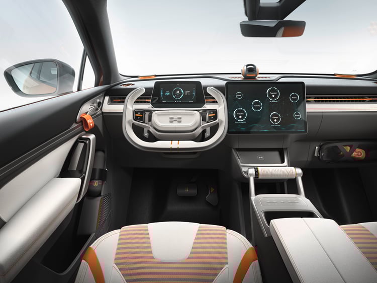 Typé sport, l’Aiways U6ion est monté sur des jantes 21 pouces et flanqué de reliefs ainsi que d’un gros aileron arrière supposé améliorer l’aérodynamisme. La calandre imposante comprend des entrées d’air rappelant étonnamment celles de véhicules thermiques. Dans l’habitacle, le constructeur chinois a placé quelques références aéronautiques comme le volant coupé dans sa partie haute, le sélecteur de marche imitant une manette de gaz et les lanières remplaçant les poignées d’ouverture des portières. L’écran de bord de 7 pouces est complété par une tablette d’infodivertissement de 14,6 pouces. Elle est surmontée par un assistant robot interagissant via la reconnaissance vocale. Malgré son gabarit, l’U6ion n’offre que 2 places sur la banquette arrière. L’espace central est réservé aux accoudoirs et espaces de rangement.